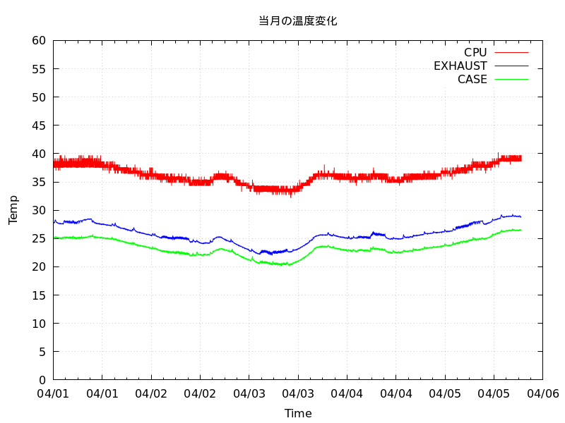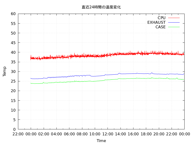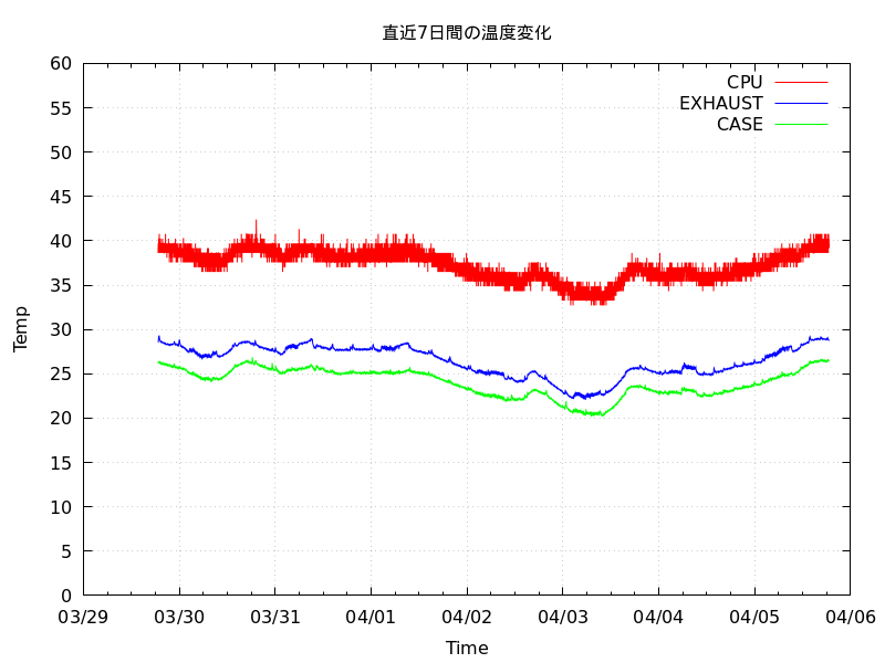 あと、I2Cから温度読み出して記録するツールも毎分起動なので、crontabに「sleep 15;/usr/local/etc/ほげほげ.plt」で遅延させないと結構な割合でエラーになるw