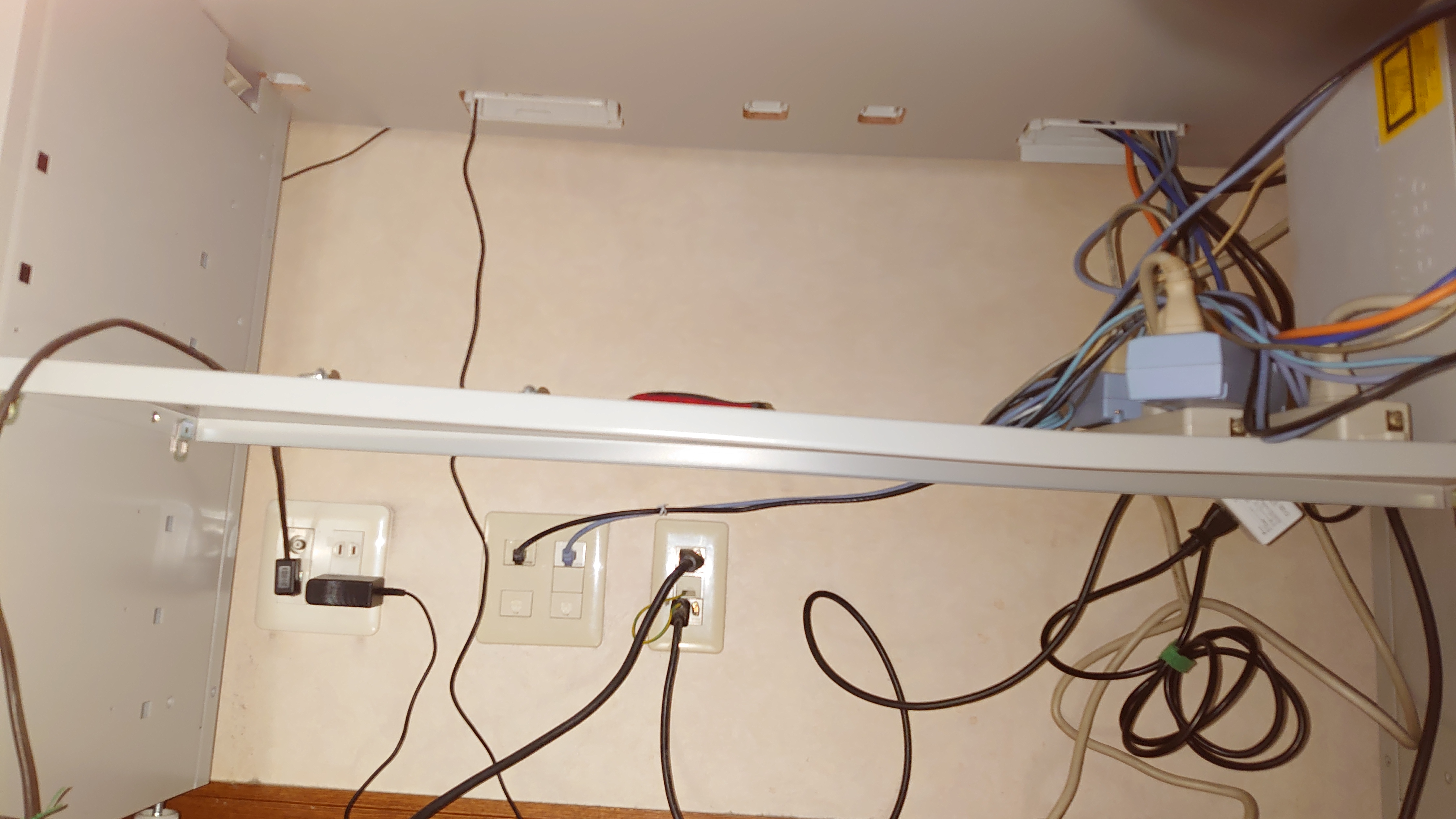 先日更新した書斎の机、バックパネルが壁のコンセントやモジュラの出口を完全に塞いでる。